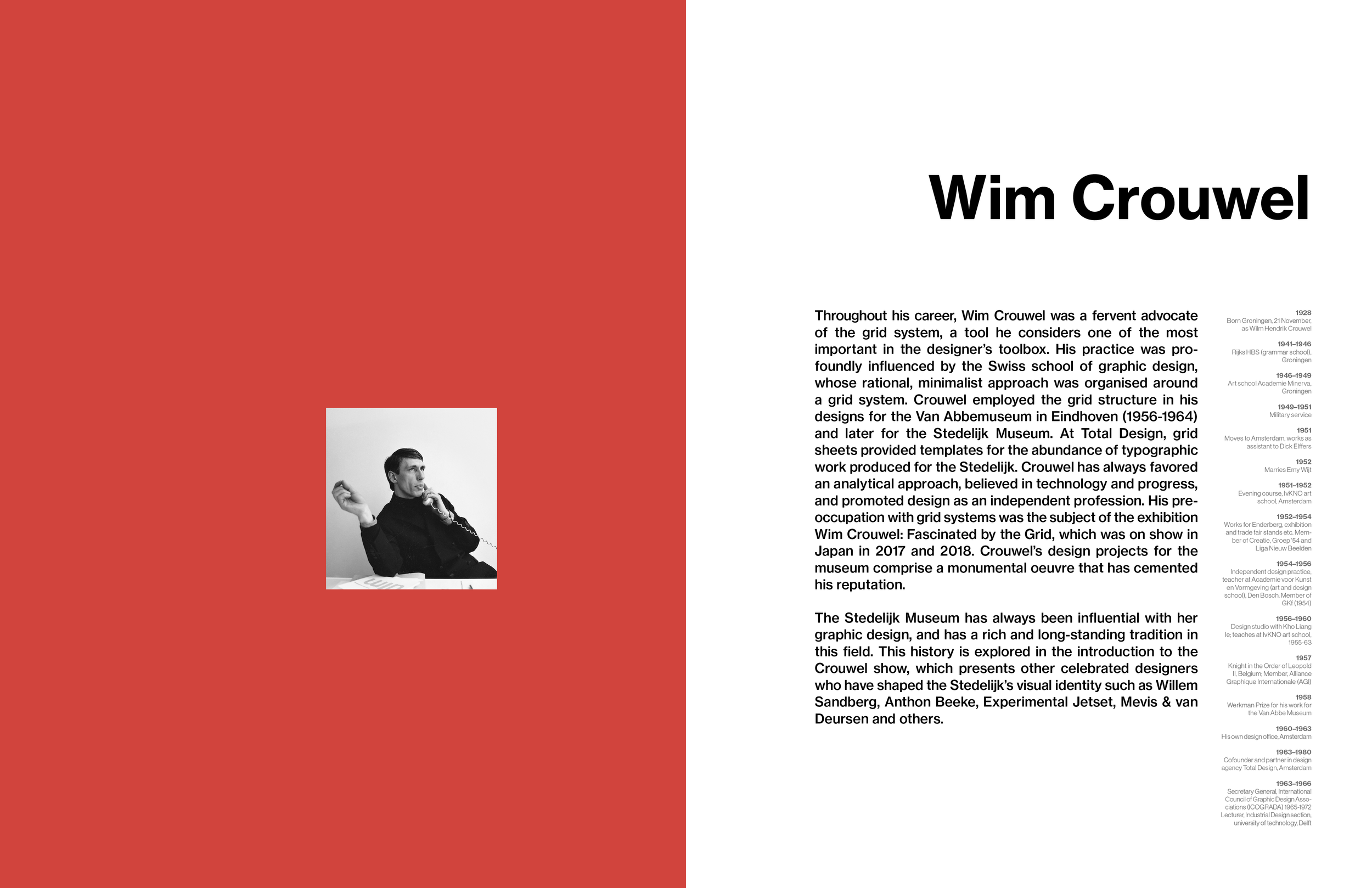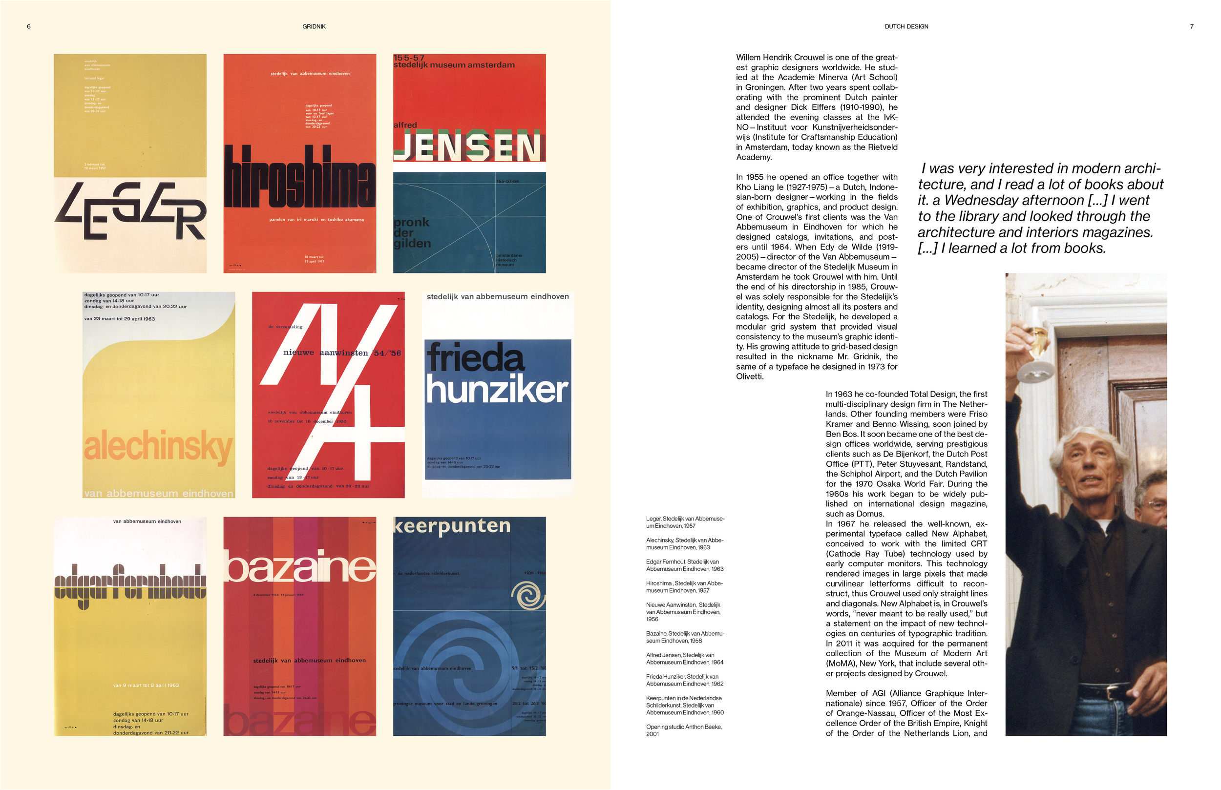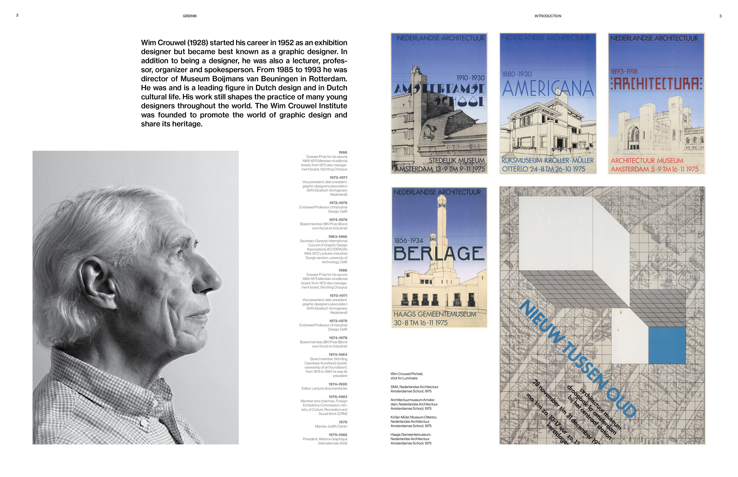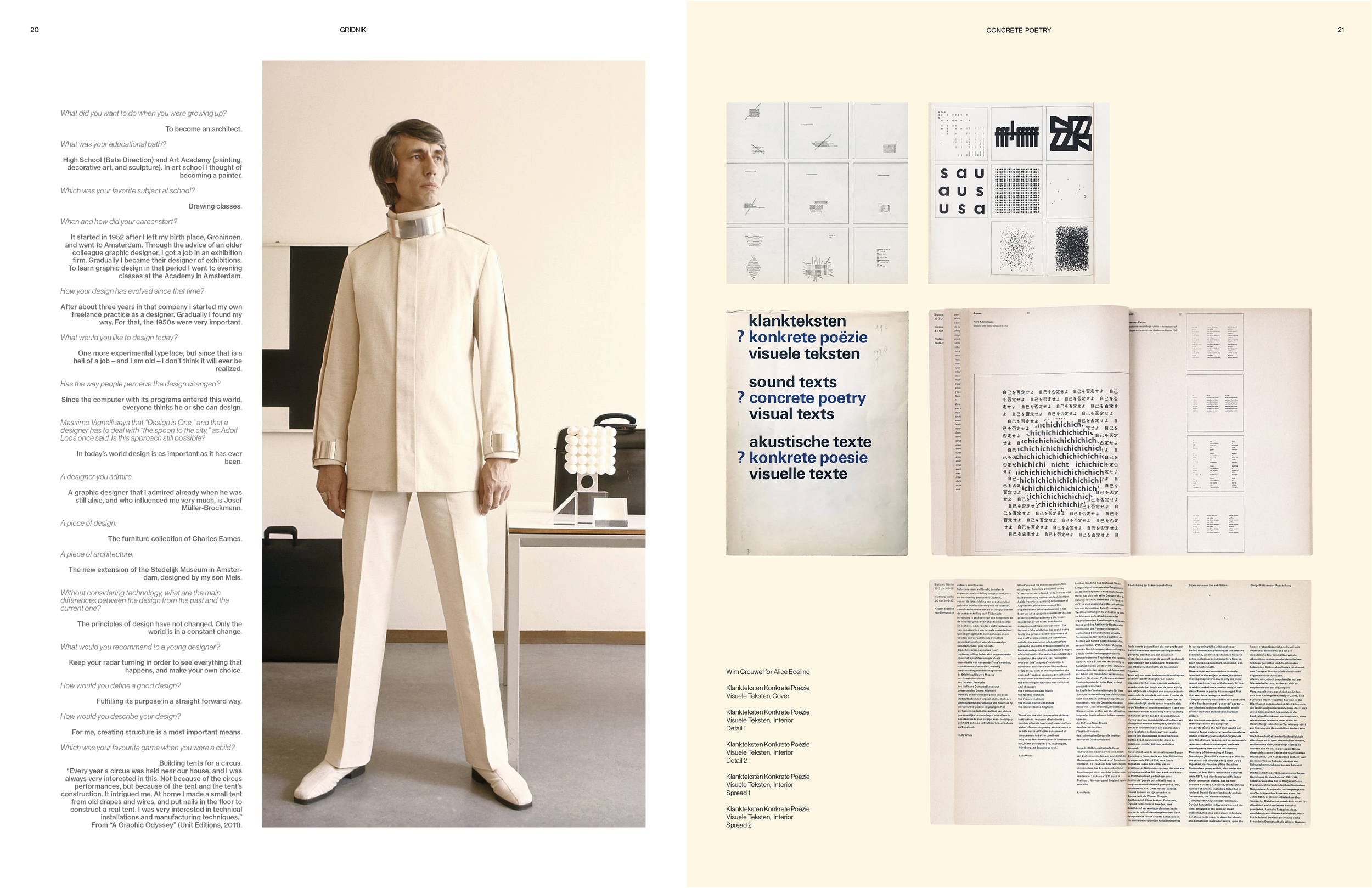 The front and back cover feature a photograph of Wim Crouwel and his associates from Total Design, with the title and subtitle typeset in two typefaces designed by Wim Crouwel—Architype Stedelijk and the famous New Alphabet. The inside front and back cover feature the earliest and latest known photographs of Crouwel respectively.