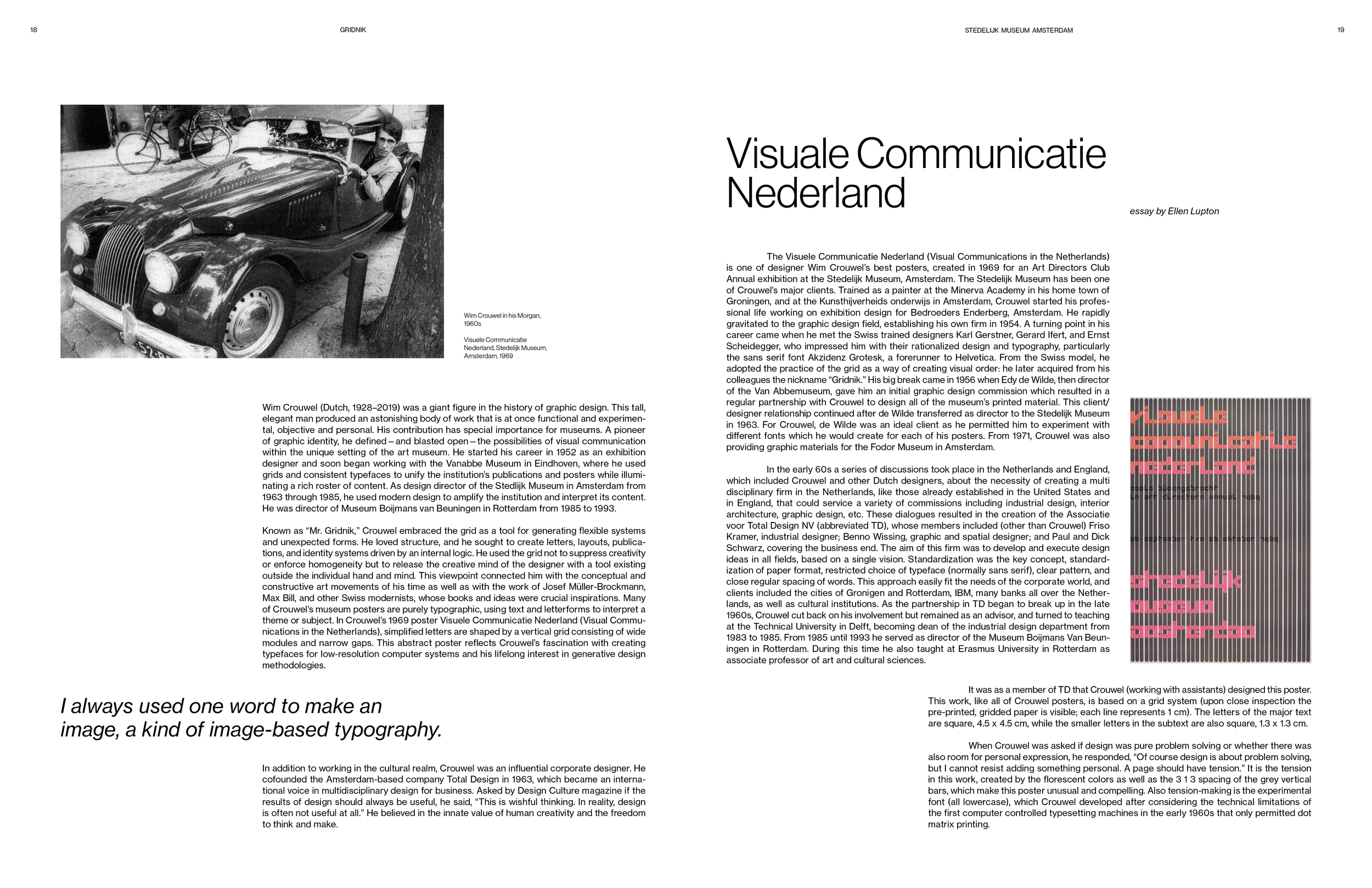 The magazine begins with some of Wim Crouwel’s final work, then jumps to the beginning and follows his career chronologically, with a few exceptions, until the end.