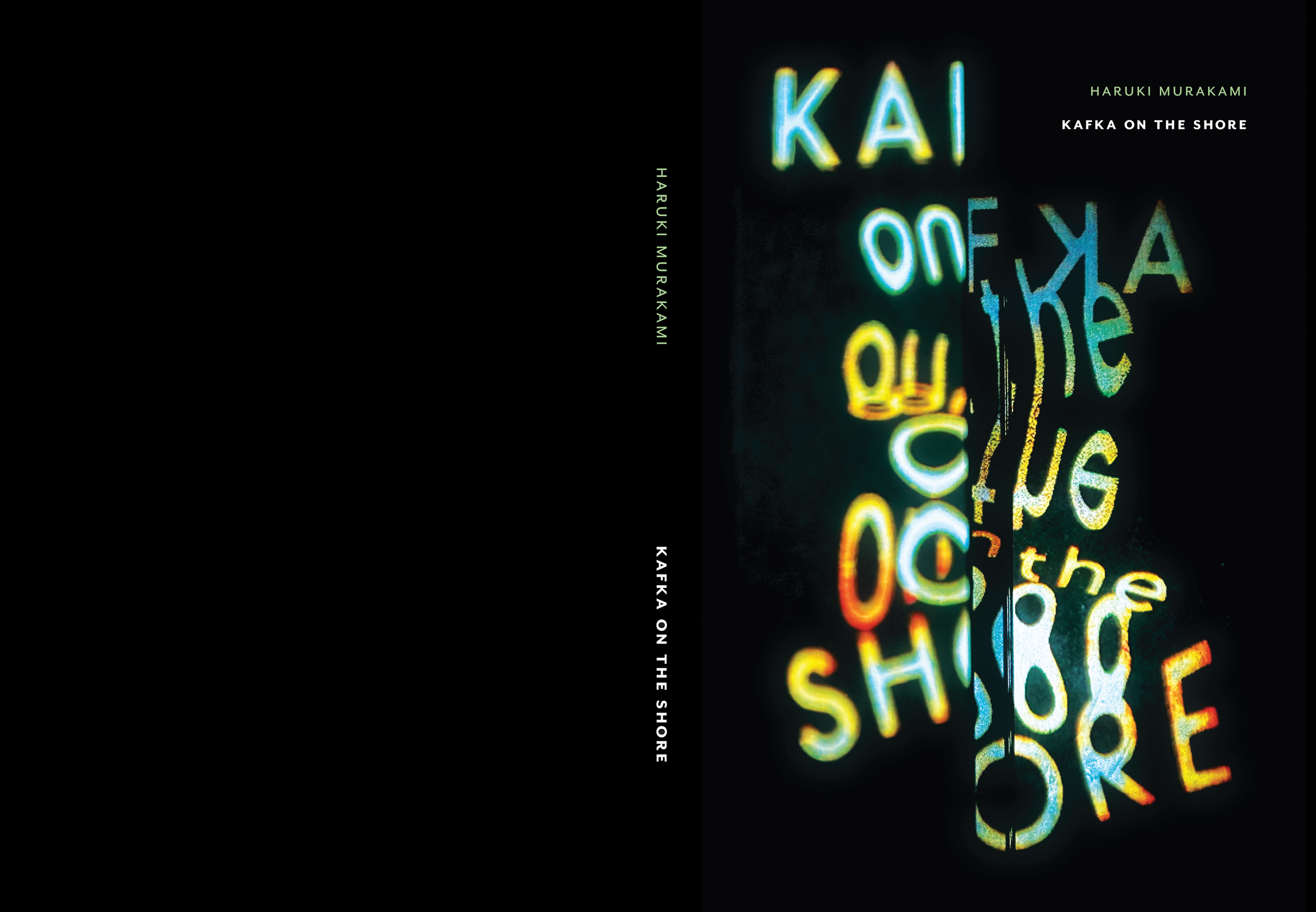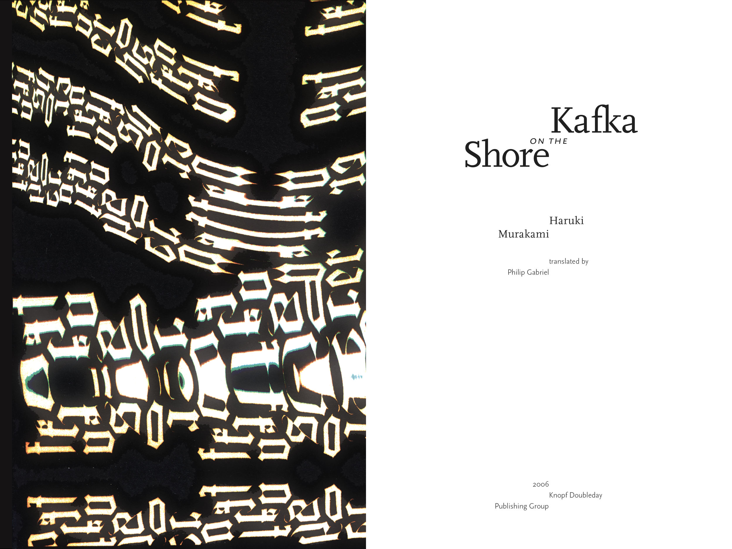 The inside front and back covers feature distorted type created via hand-setting type and distorting it in a method similar to the front cover. The two groups of distorted type are composed of abstract compositions built using the words “Kafka” and “Shore,” and represent a glistening sunset viewed from the titular shore. The edge from the front cover is echoed on the title page of the book.