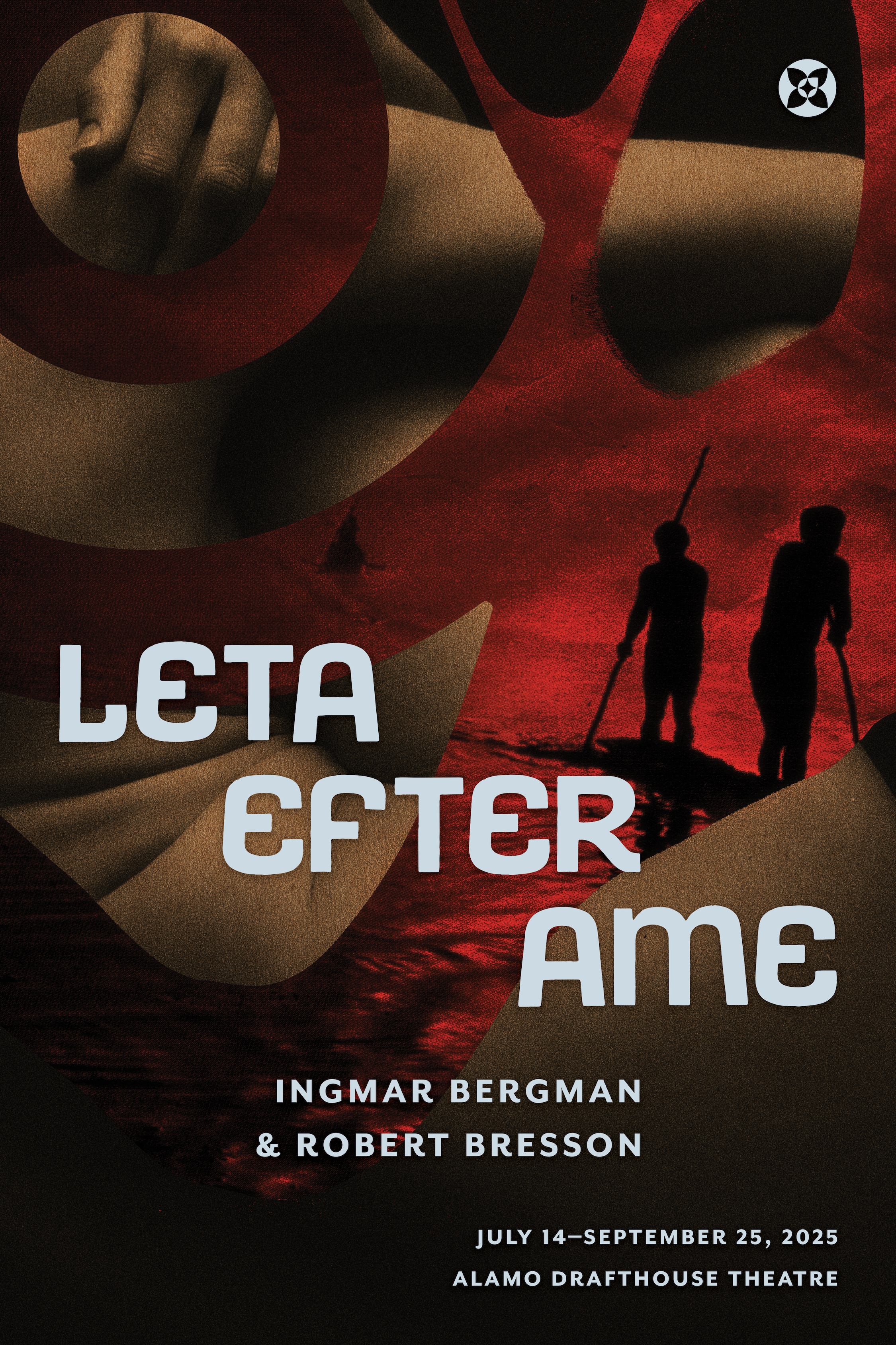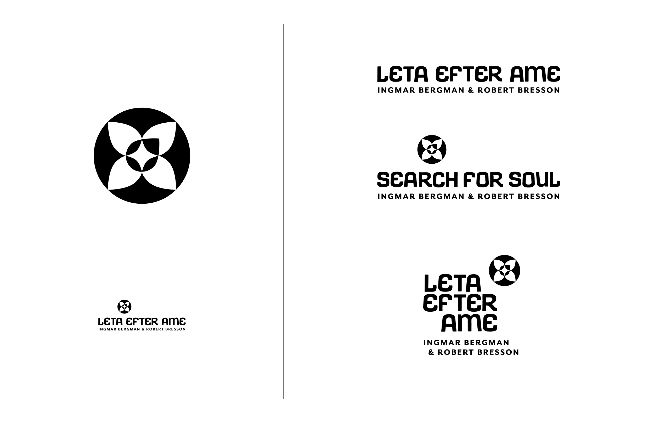Leta Efter Ame is a film festival that unites the work of Ingmar Bergman and Robert Bresson through their shared exploration of the human condition. The name blends the Swedish phrase Leta Efter (“search for”) and the French word Âme (“soul”). The trademark reflects this union with layered symbols of the soul: a lotus flower’s four petals referencing Norse mythology, a star symbolizing the soul of the French people, and a compass pointer breaking symmetry to suggest direction in the search for meaning. The wordmark uses the refined Avanti Gothic typeface to echo the character of the films, while supporting text is set in Mr Eaves Sans.